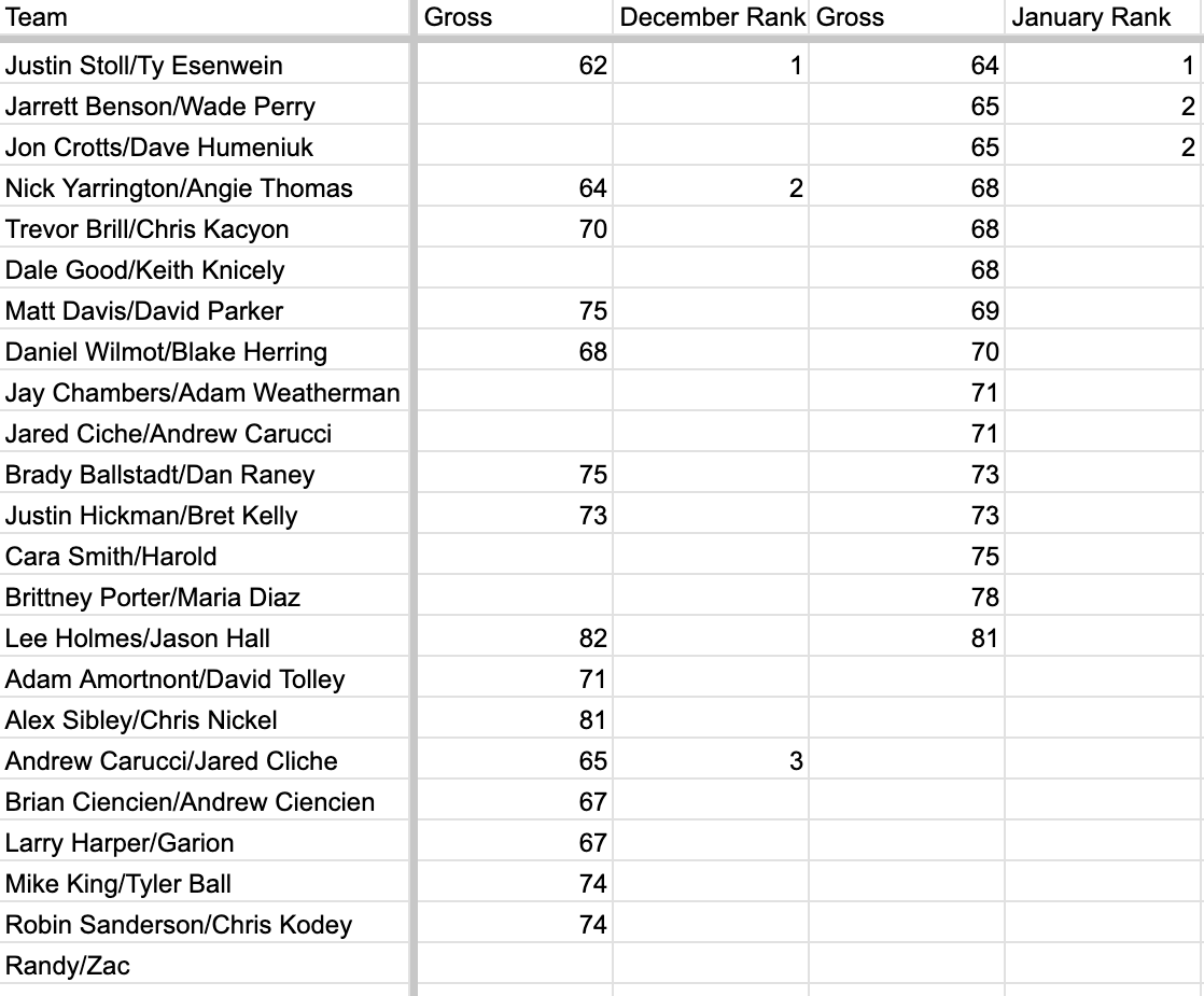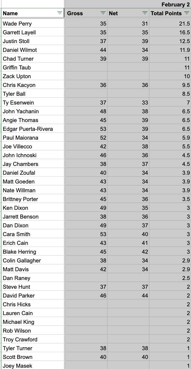 A: The points are awarded every week based on rankings of players in both the gross and net division. First place gets 10 points, 2nd place gets 5 points, 3rd place gets 4 points, 4th place gets 3 points, and 5th place gets 2 points. Everyone else is awarded 1 point for participating. If there’s a tie, the players will split the points awarded. For example, if Joe and Jon tie for first, they will split the first and second place points and each be awarded 7.5 points. This hopefully explains why there’s some decimals.